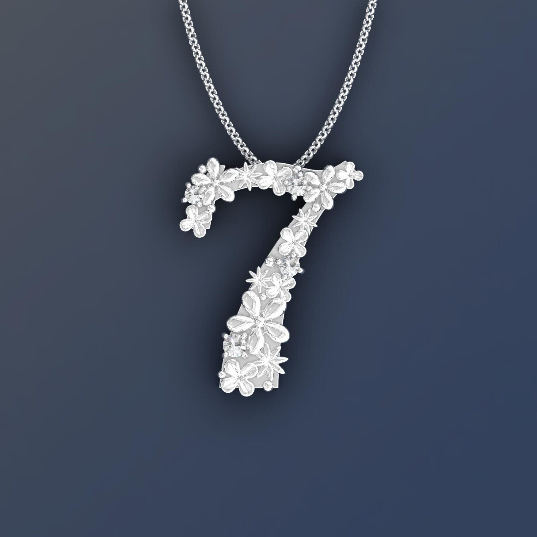 数字の7の表面に様々な花を花畑のようにデザインしたペンダント